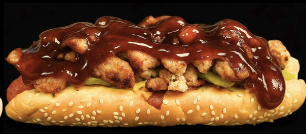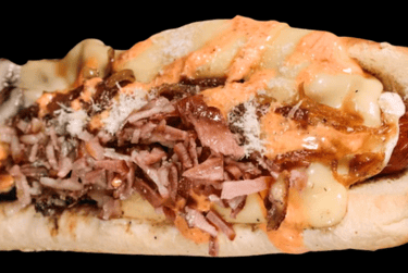 Con salchicha de pavo, queso de hebra fundido, arrachera asada, guacamole fresco, cebolla caramelizada,bañado en salsa BBQ hot.