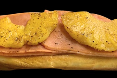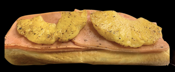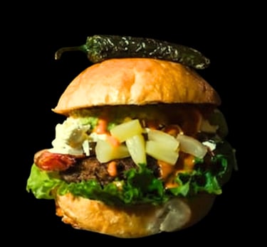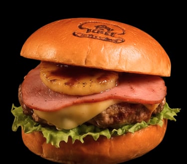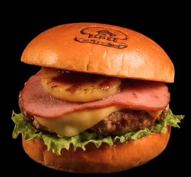Jugosa carne de sirloin, piña y jamón asados al punto, tocino dorado, cebolla caramelizaday queso fundido en pan esponjoso dorado.