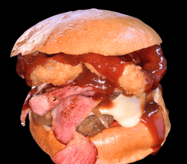 Doble carne de sirloin con arrachera y chistorra asada, queso fundido gratinado, cebolla caramelizada y salsa habanero intensa para los de buen diente.