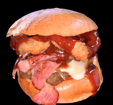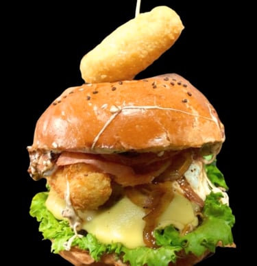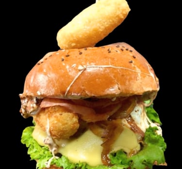 Carne de sirloin preparada en casa, tocino crujiente, queso fundido aros de cebolla, boneles bañados de bbq, ranch y cebolla caramelizada que le da el sabor único de la casa.