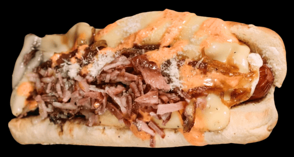 Con salchicha de res, queso hebra fundido arrachera y chistorra asadas, cebolla caramelizada, queso parmesano con salsa habanero un toque cremoso y picoso