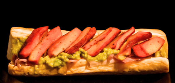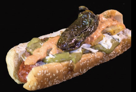 Pan jumbo suave con salchicha de pavo, chile jalapeño asado, queso oaxaca, guacamole cebolla caramelizada y piña asada bañada en salsa morita